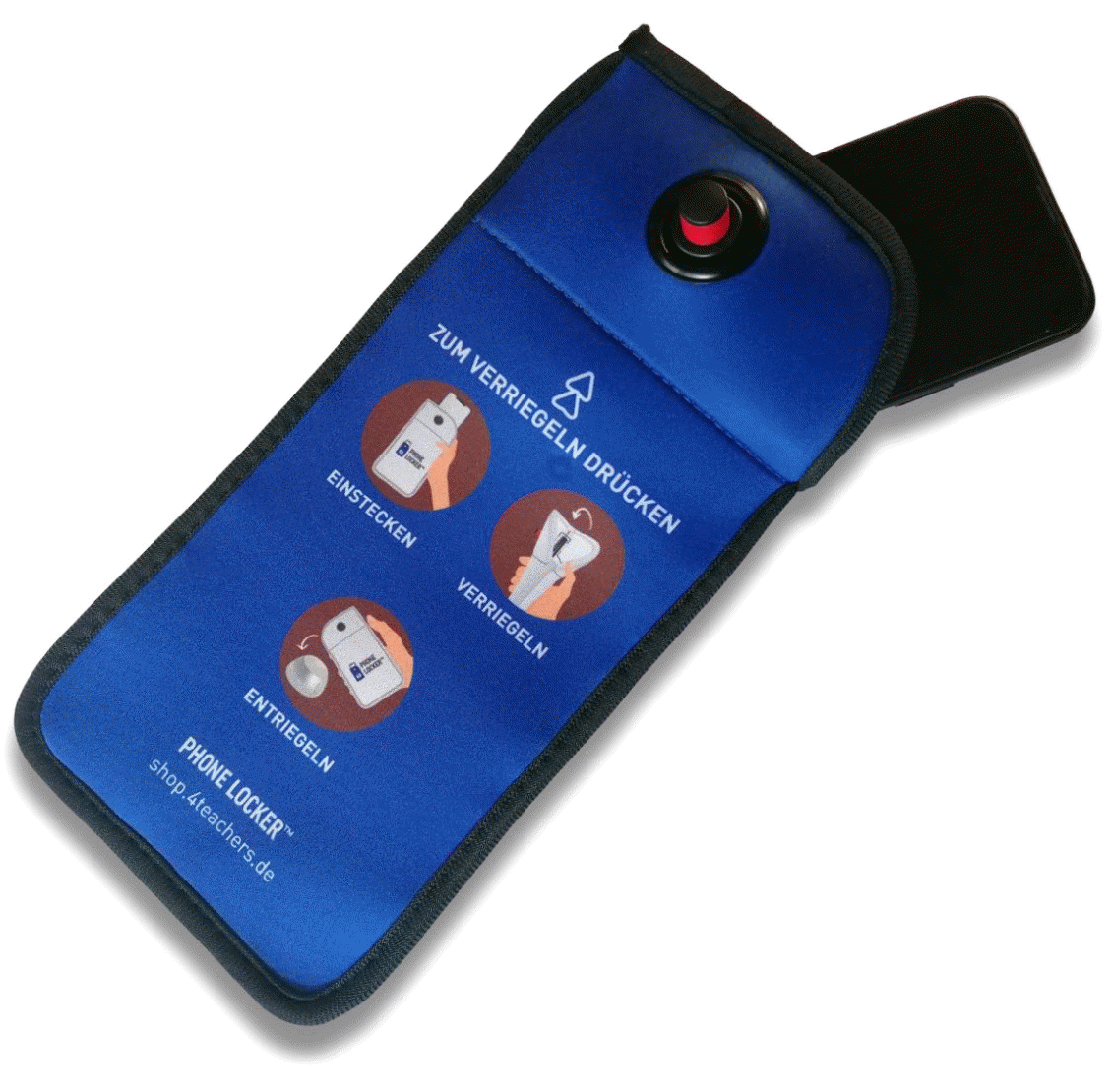 The smartphone is placed inside the pouch and locked with a single motion. Unlocking is only possible using the corresponding magnetic unlocker, which can be held by the teacher or made available in the classroom. The unlocker is sold separately.